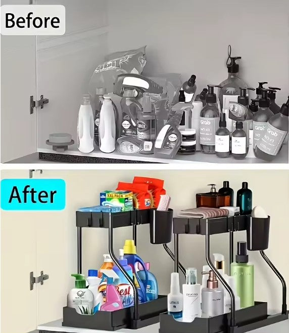 Unser Organizer passt sich den Rohren an und schafft mehr Stauraum für Reinigungsmittel, Flaschen und Zubehör – stabil, praktisch und einfach zu montieren.
